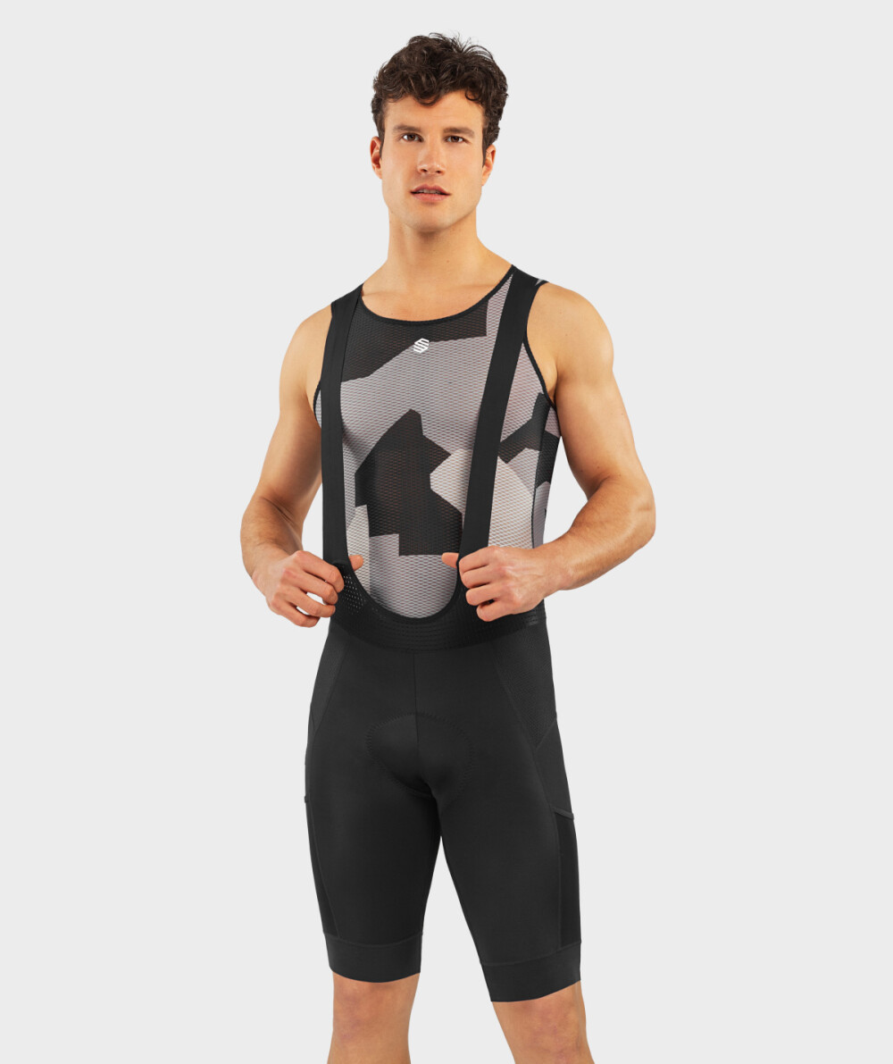 Made of quick-drying, 4-way stretch Italian MITI fabric panels for optimal breathability and ease of movement. Ultra-lightweight laser-cut suspenders and multi-panel cut combines compression with micro-perforated areas for enhanced comfort. Elastic bands on the legs with anti-slip silicone print. Side and rear mesh pockets. UPF 50.